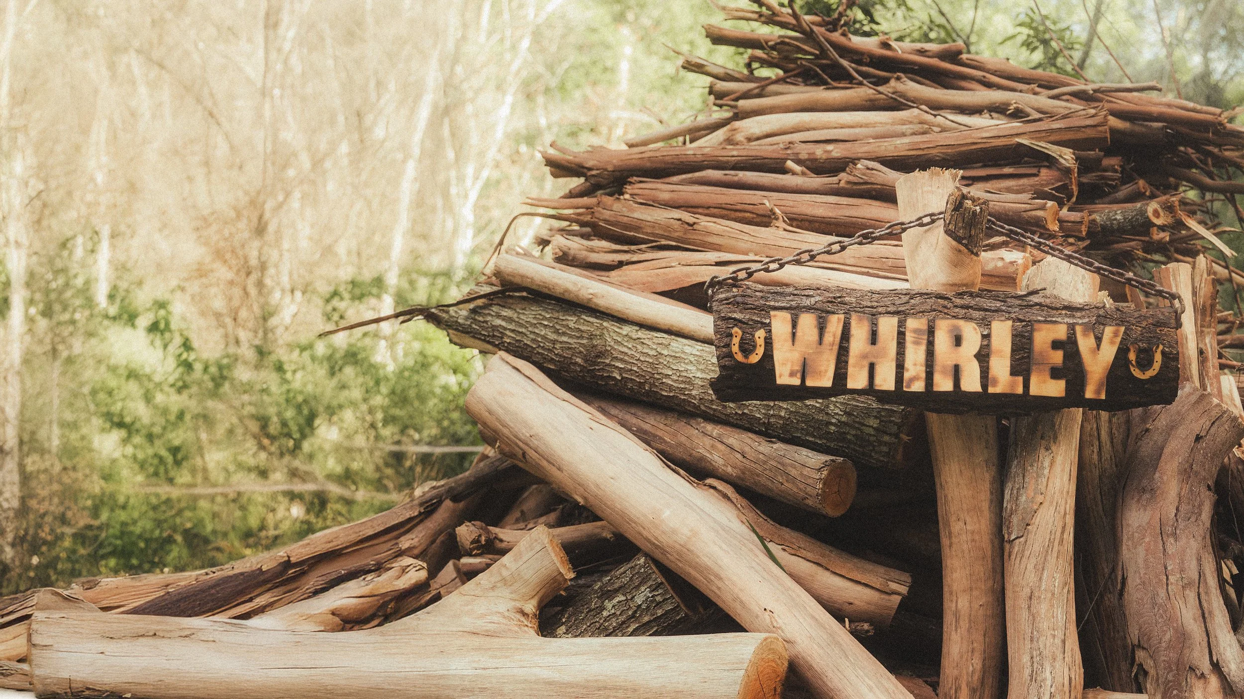 A rustic wooden sign with metal horseshoe accents that reads 'WHIRLEY,' hanging from a chain, placed on weathered logs on the ground outdoors.